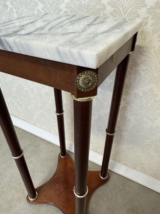 Konferenčný stolík s doskou z mramoru v jemnom tóne s ružovkastým žilkovaním. Kanelované nohy sú zdobené bronzovými rozetami a zakončené pätkami, ktoré podčiarkujú celkový výraz.Dvojetážový príborník s mramorovou doskou