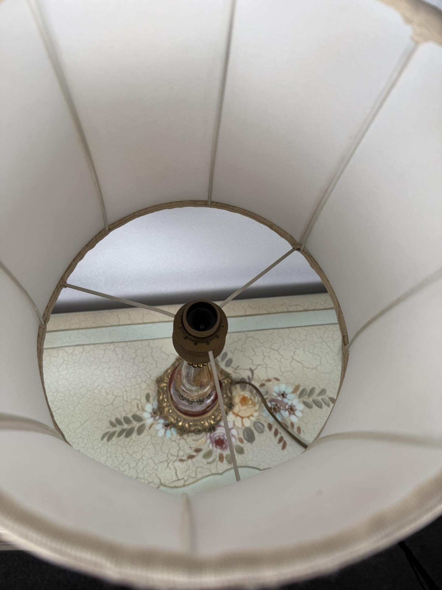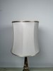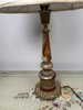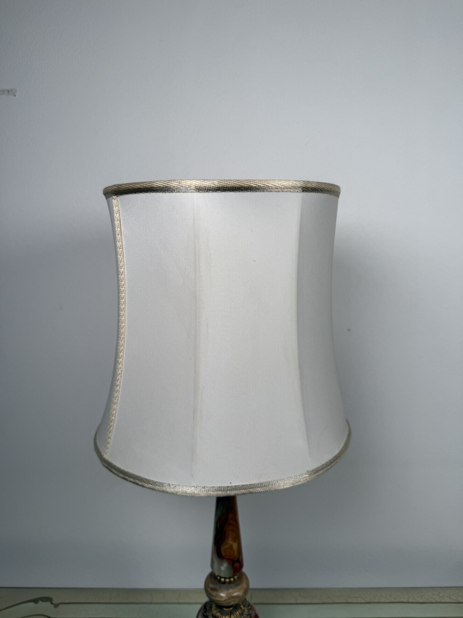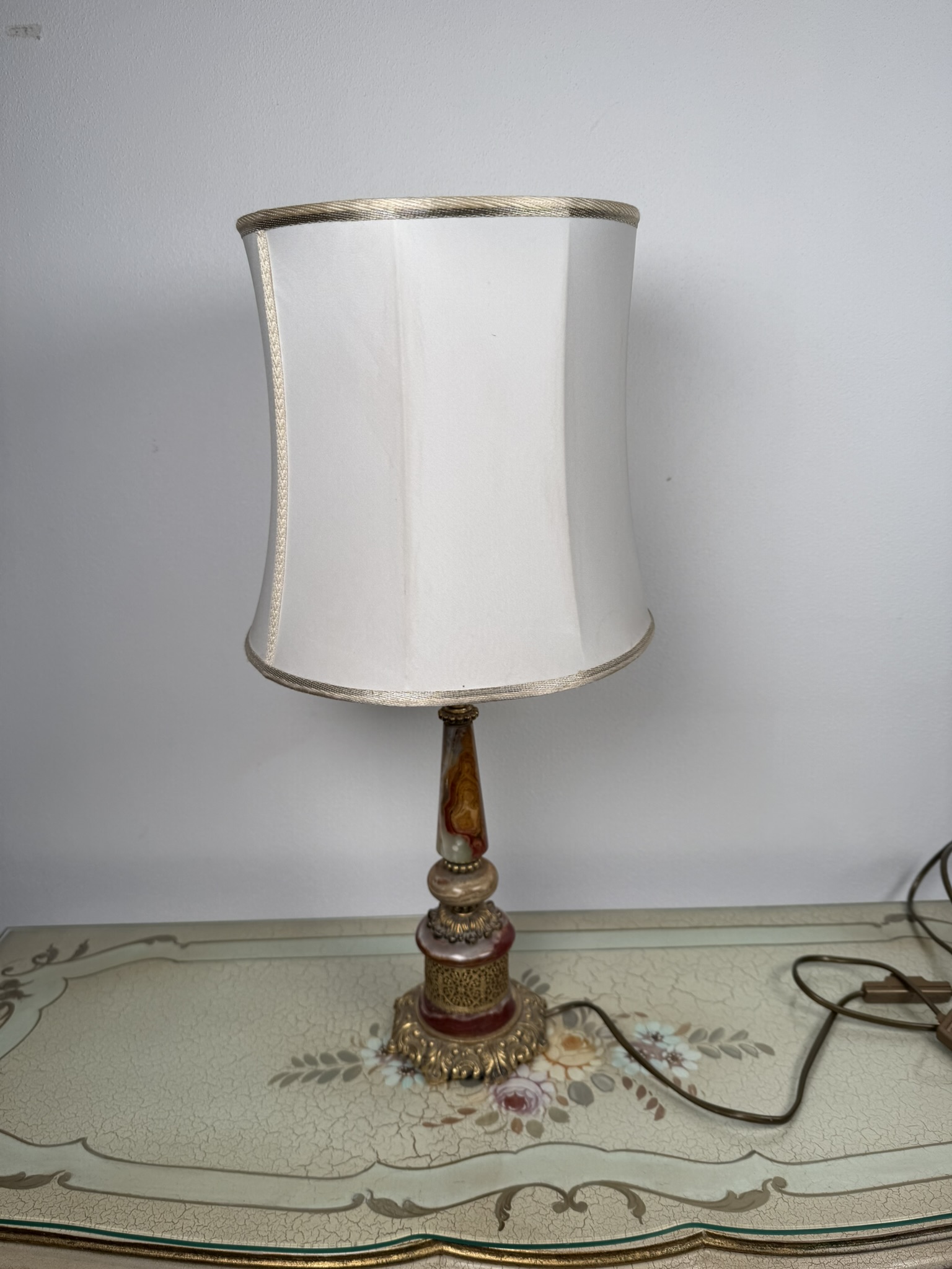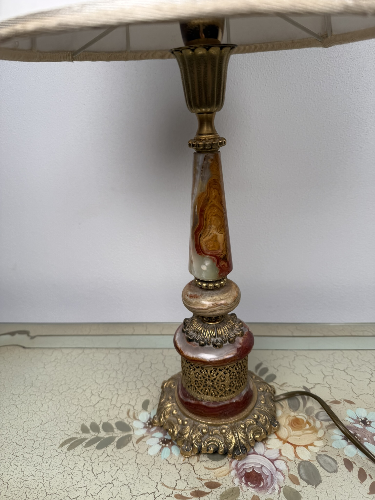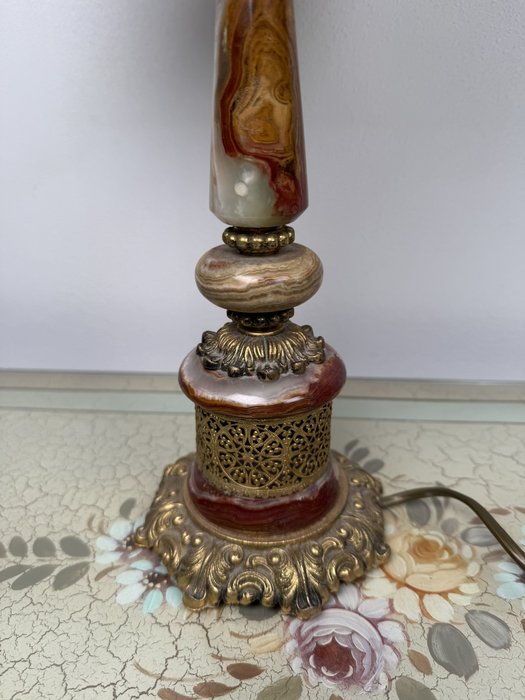 Stolová elektrická lampa s telom z lešteného onyxu v kombinácii červených, medových a krémových tónov. Spodnú časť tvorí masívna pätka s ornamentom a kovovými detailmi v teplom zlatom odtieni, doplnená perforovaným dekórom v strednej časti. Lampa je osadená svetlým textilným tienidlom.