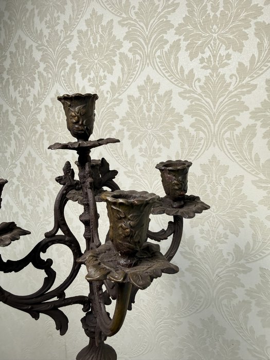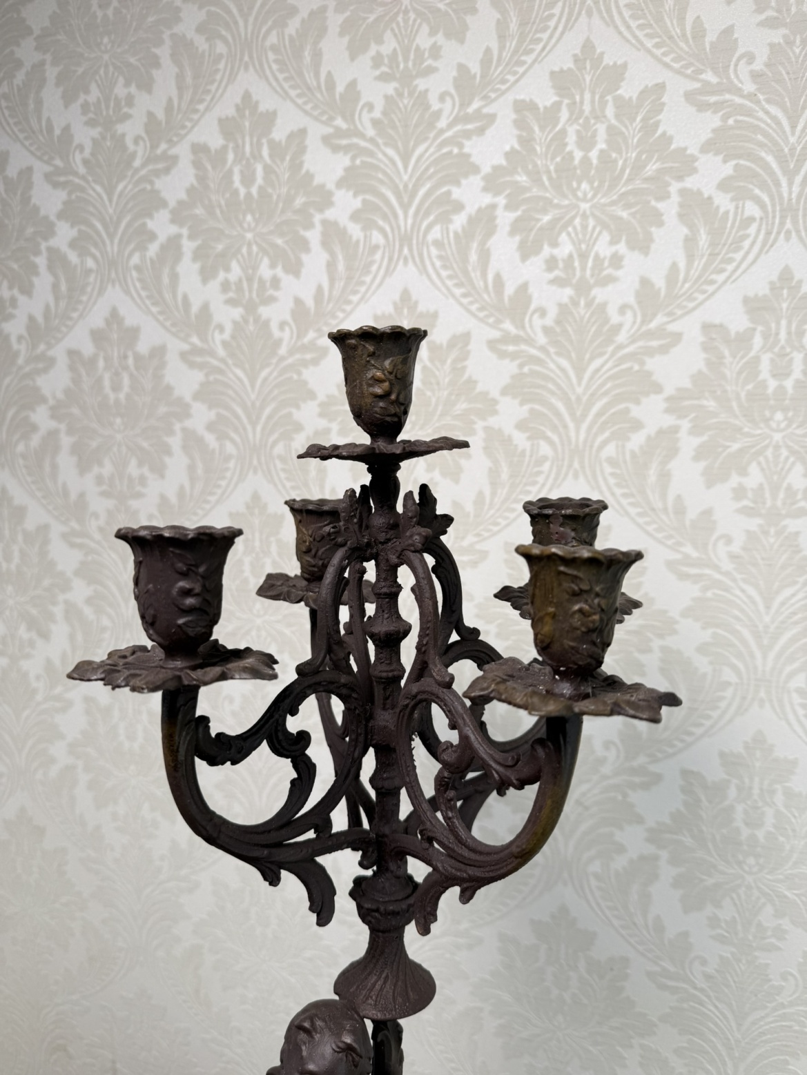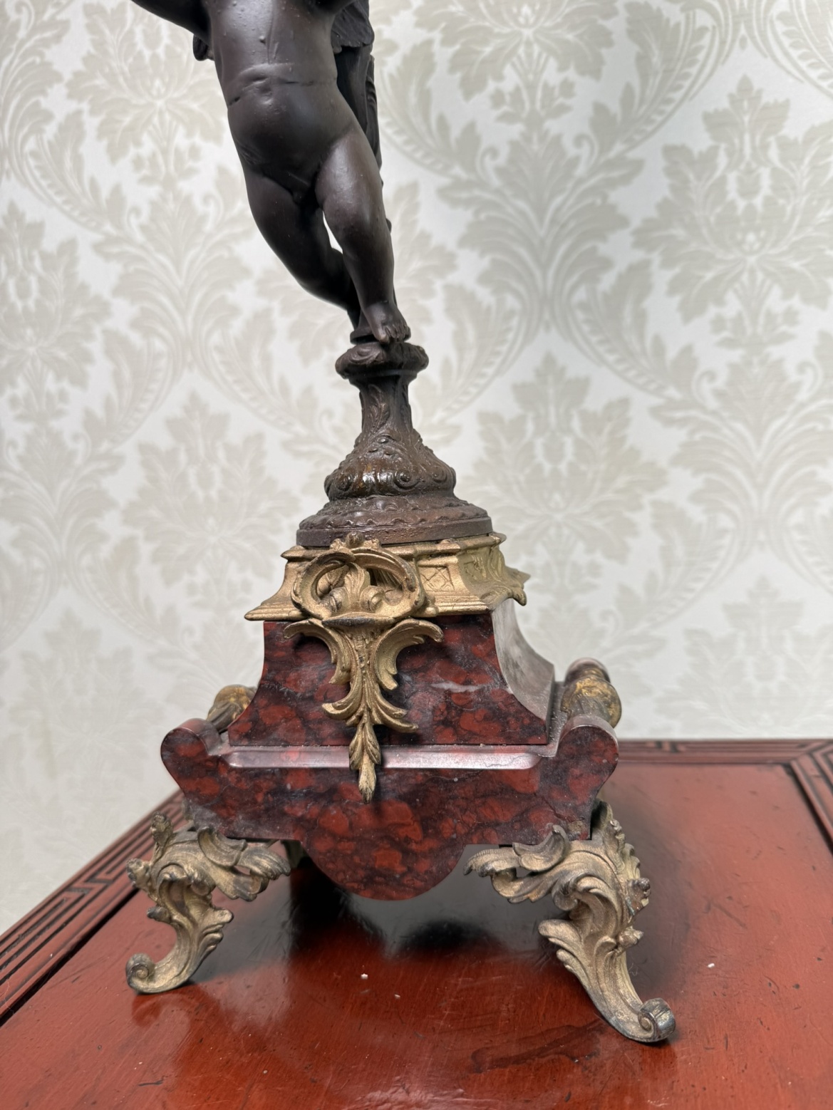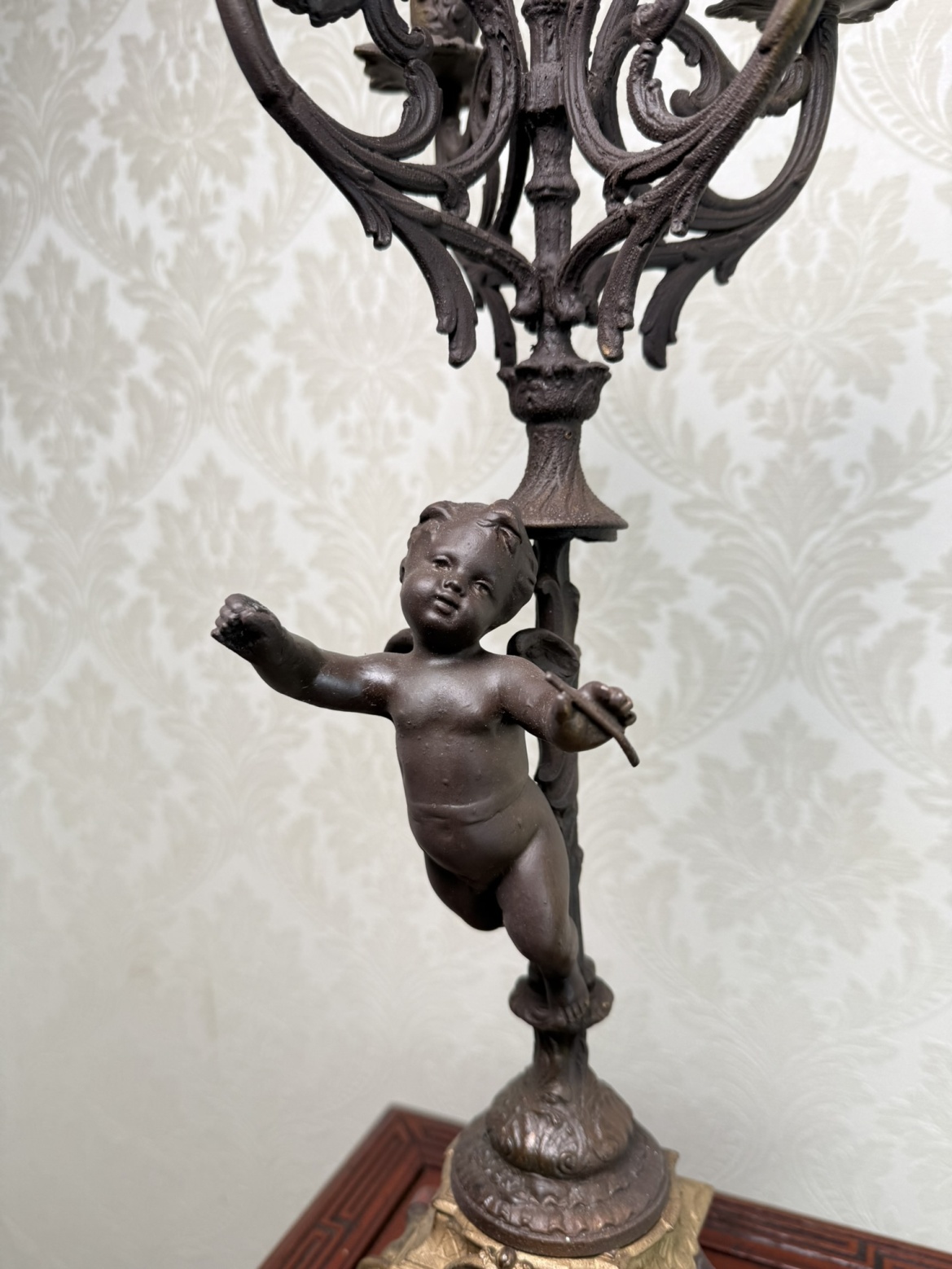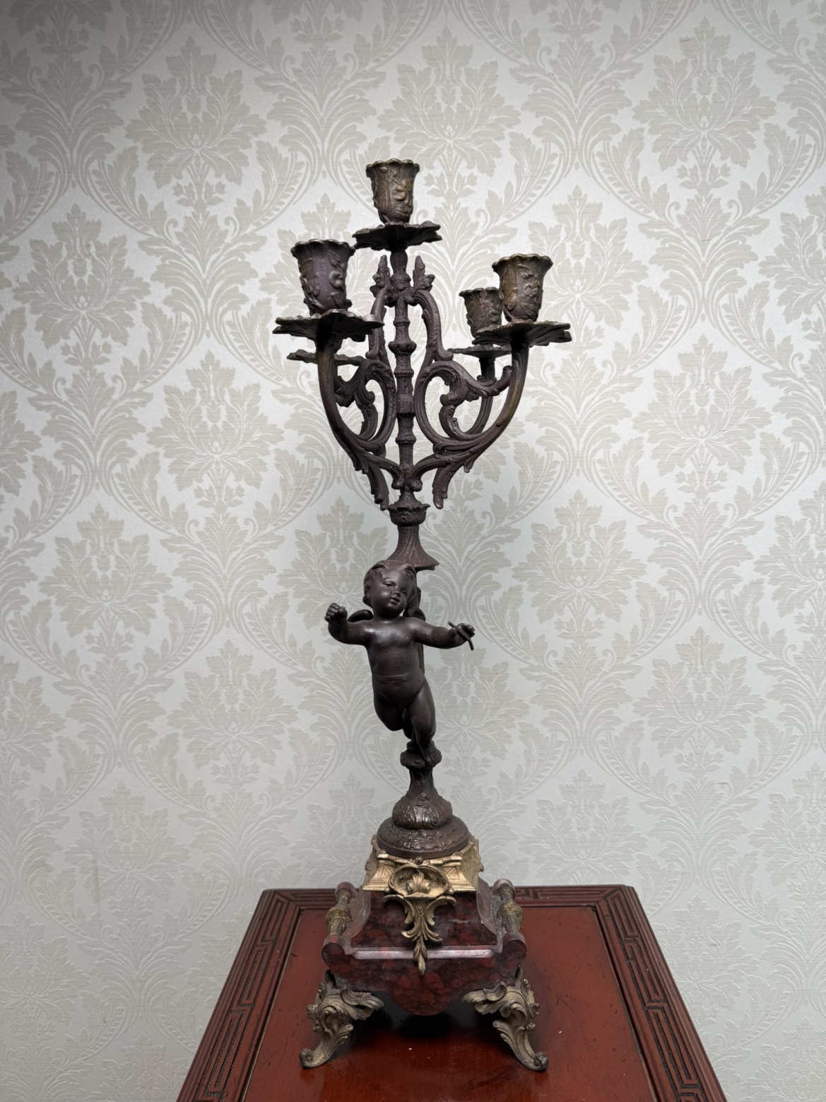 Svietnik na päť sviečok s výraznou figúrou putti uprostred. Podstavec je z červeného mramoru s liatinovými aplikáciami a bohato tvarovanými nôžkami. Soška drží ruky voľne bez atribútu.242,26 €