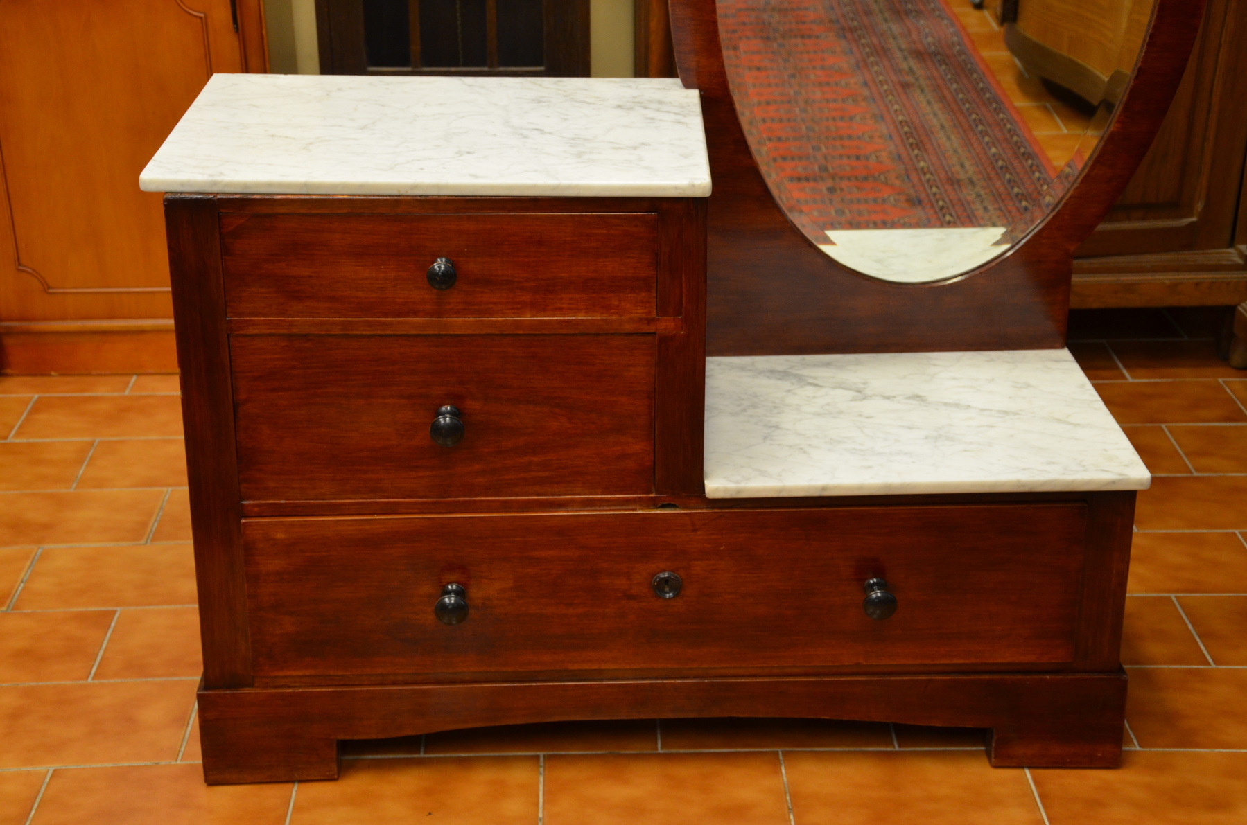 Toaletní stolek s dominantním oválným zrcadlem je vyroben z kvalitního dřeva . Dvě mramorové desky pro umístění toaletních potřeb. Tři prostorné zásuvky poskytují dostatek úložného prostoru.