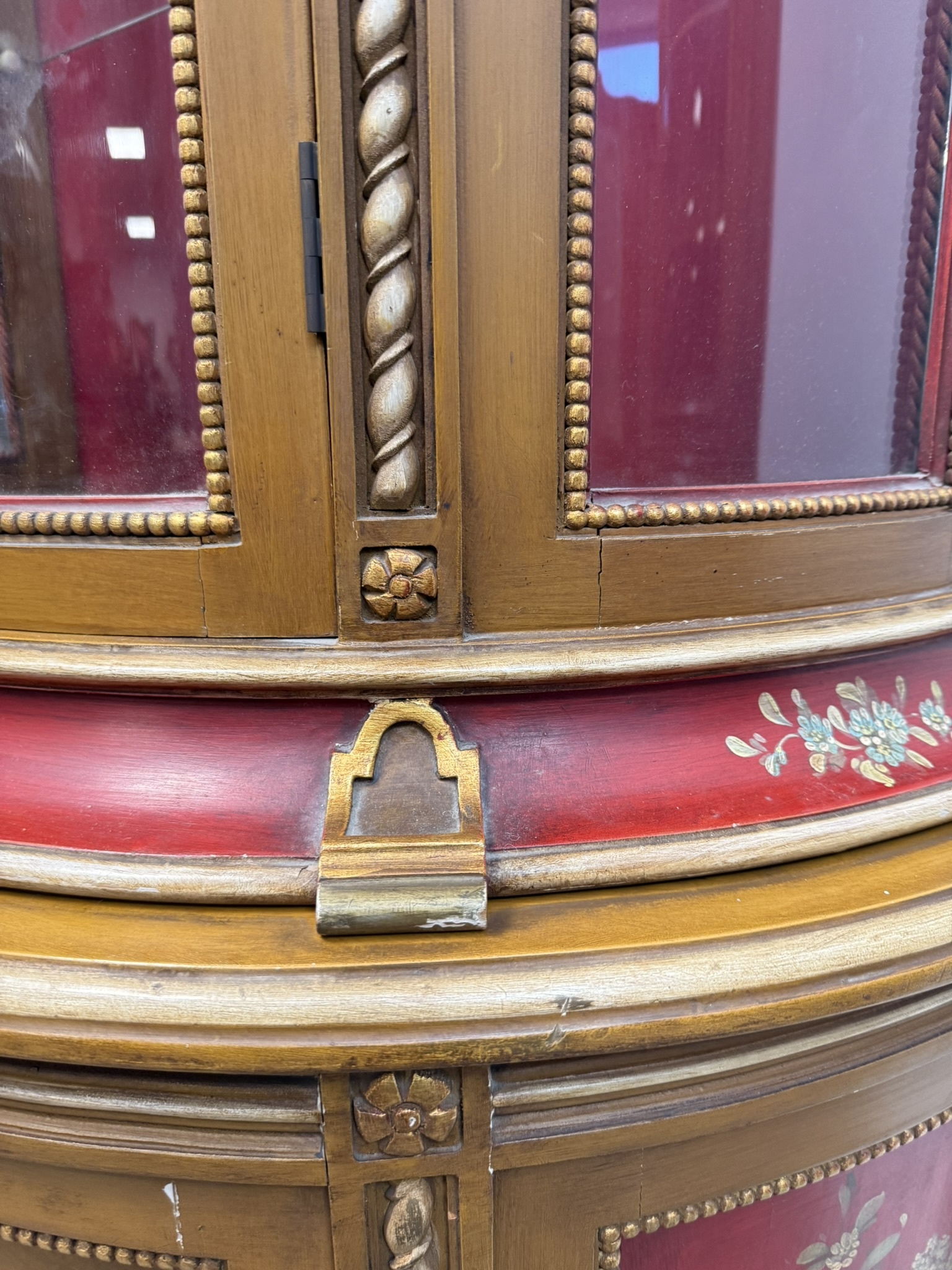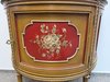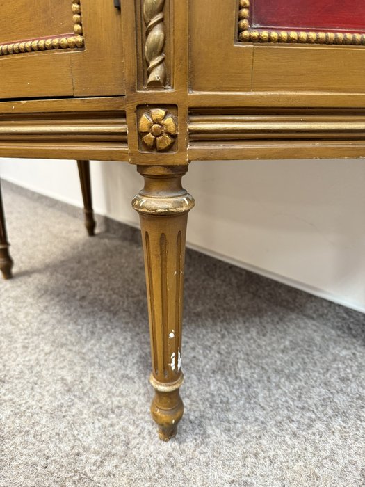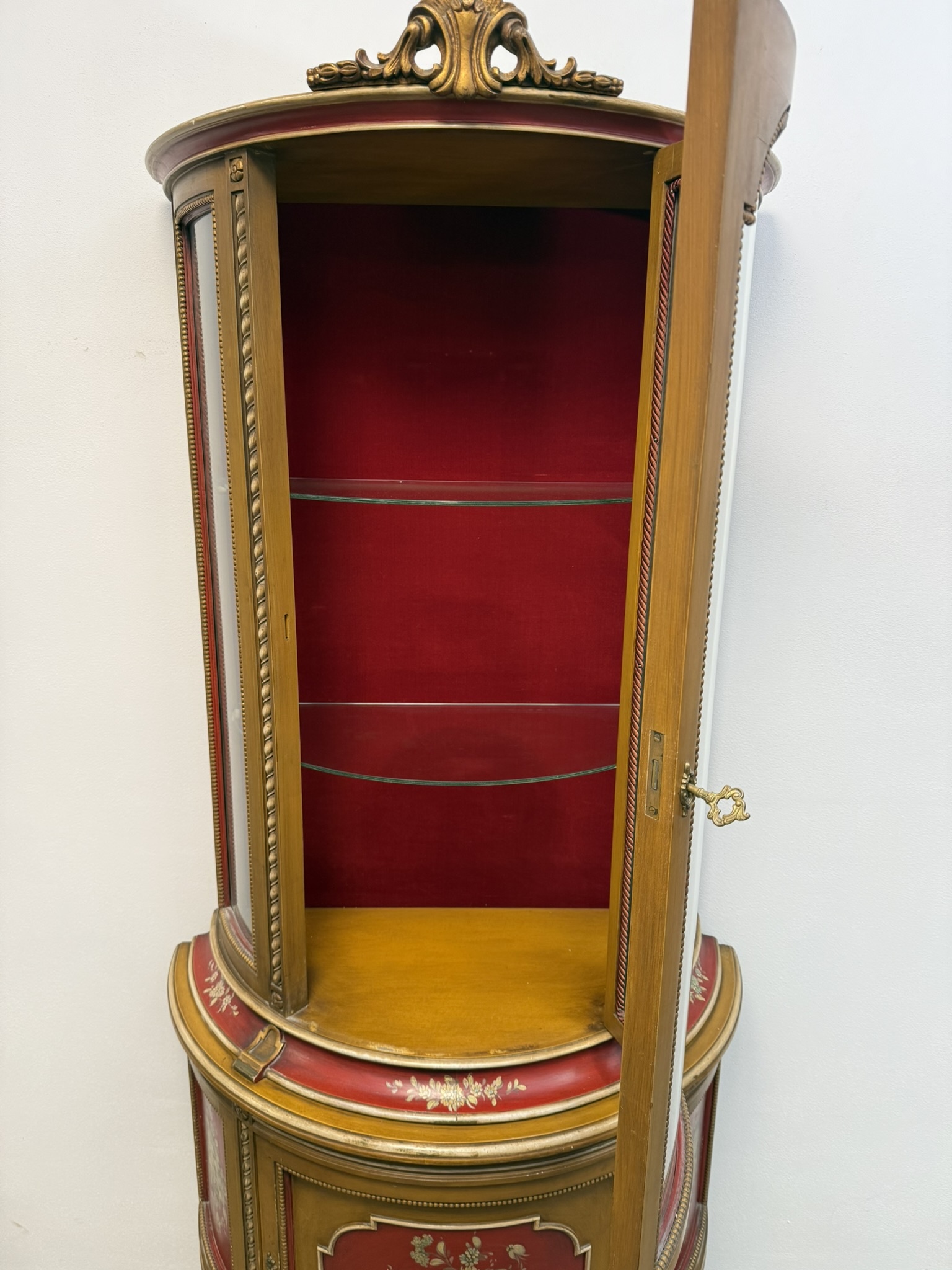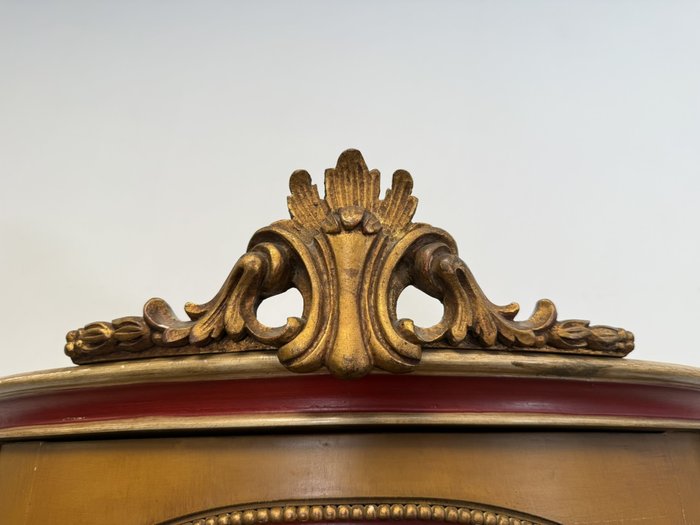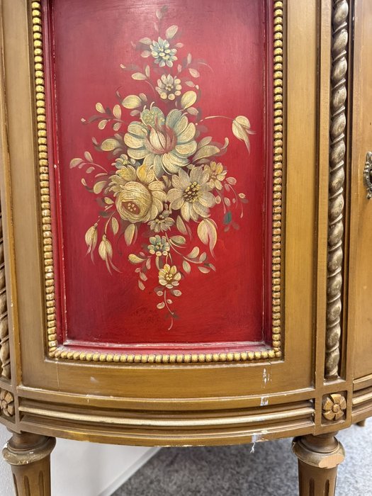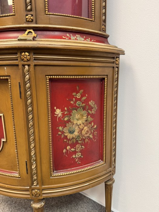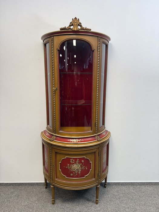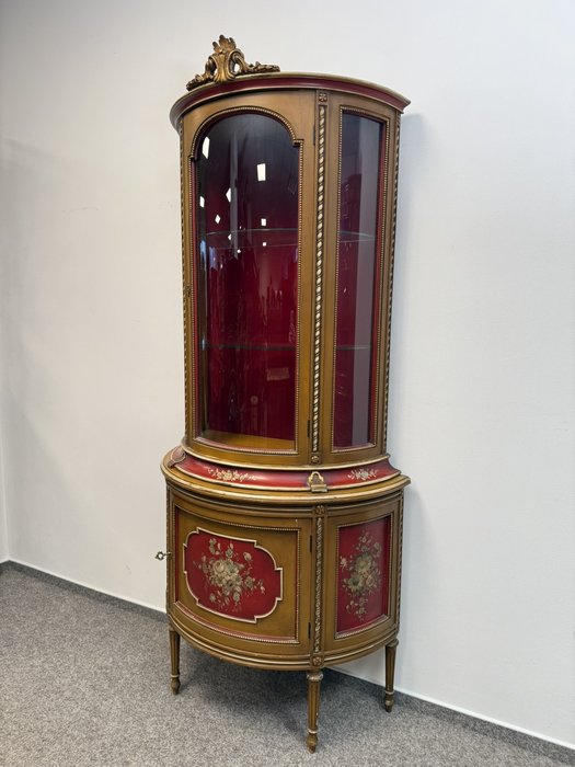 Vitrína s presklenou hornou časťou a červeným zamatovým pozadím. Spodné dvierka zdobia ručne maľované florálne motívy v rámovaní s nádychom starozlatej. Detaily ako čapované stĺpiky, drobná rezba a korunka s patinou.970 €