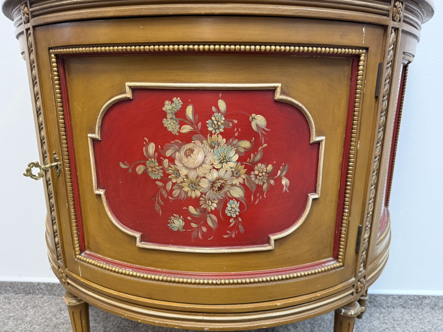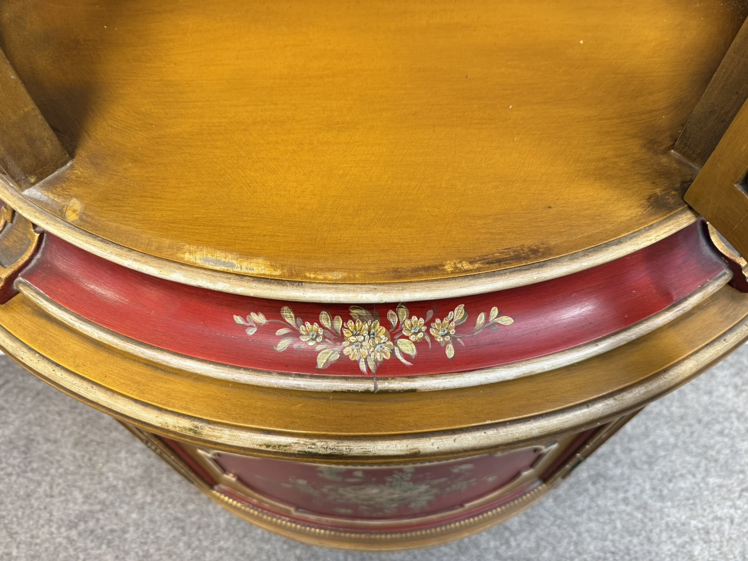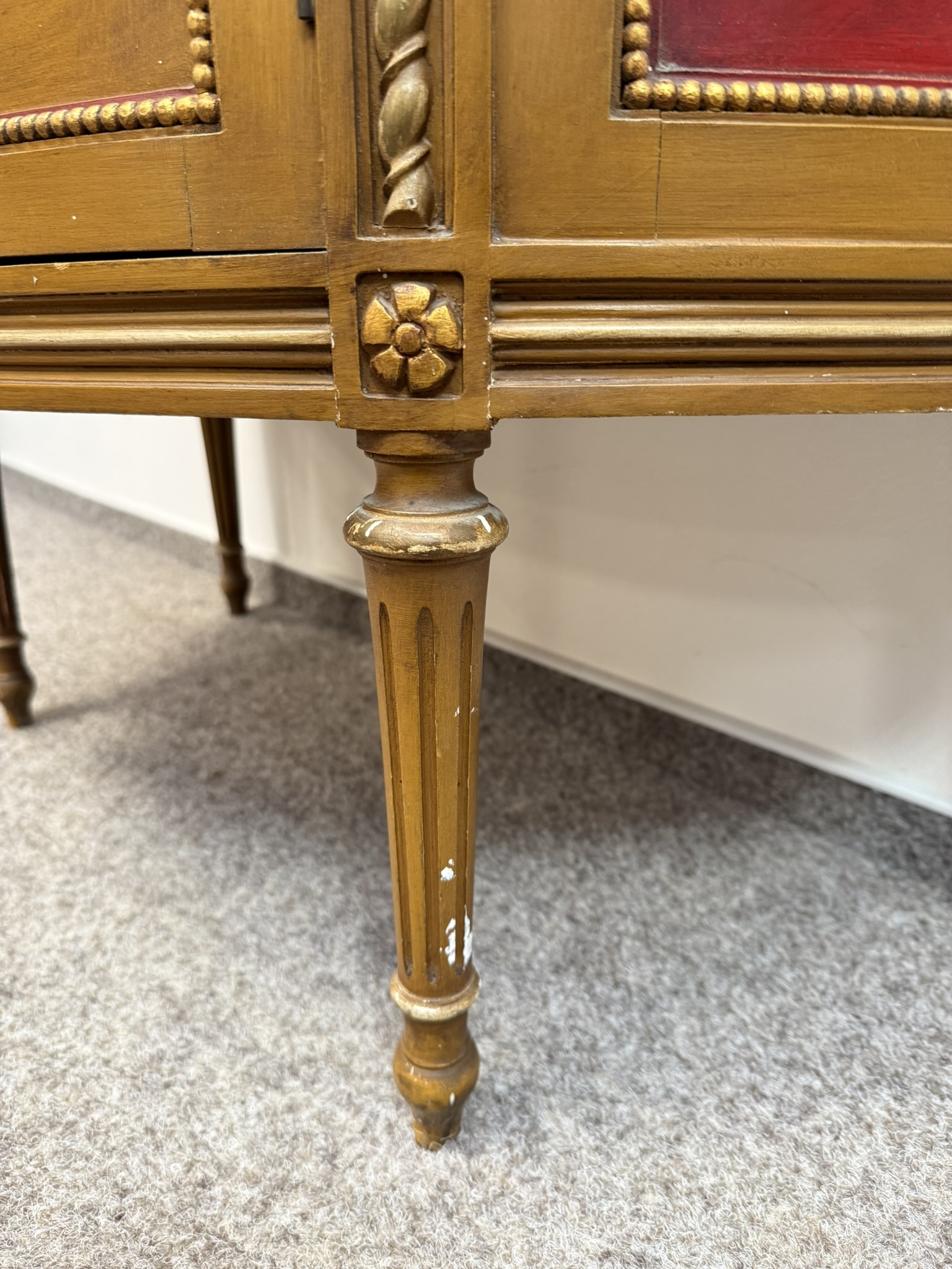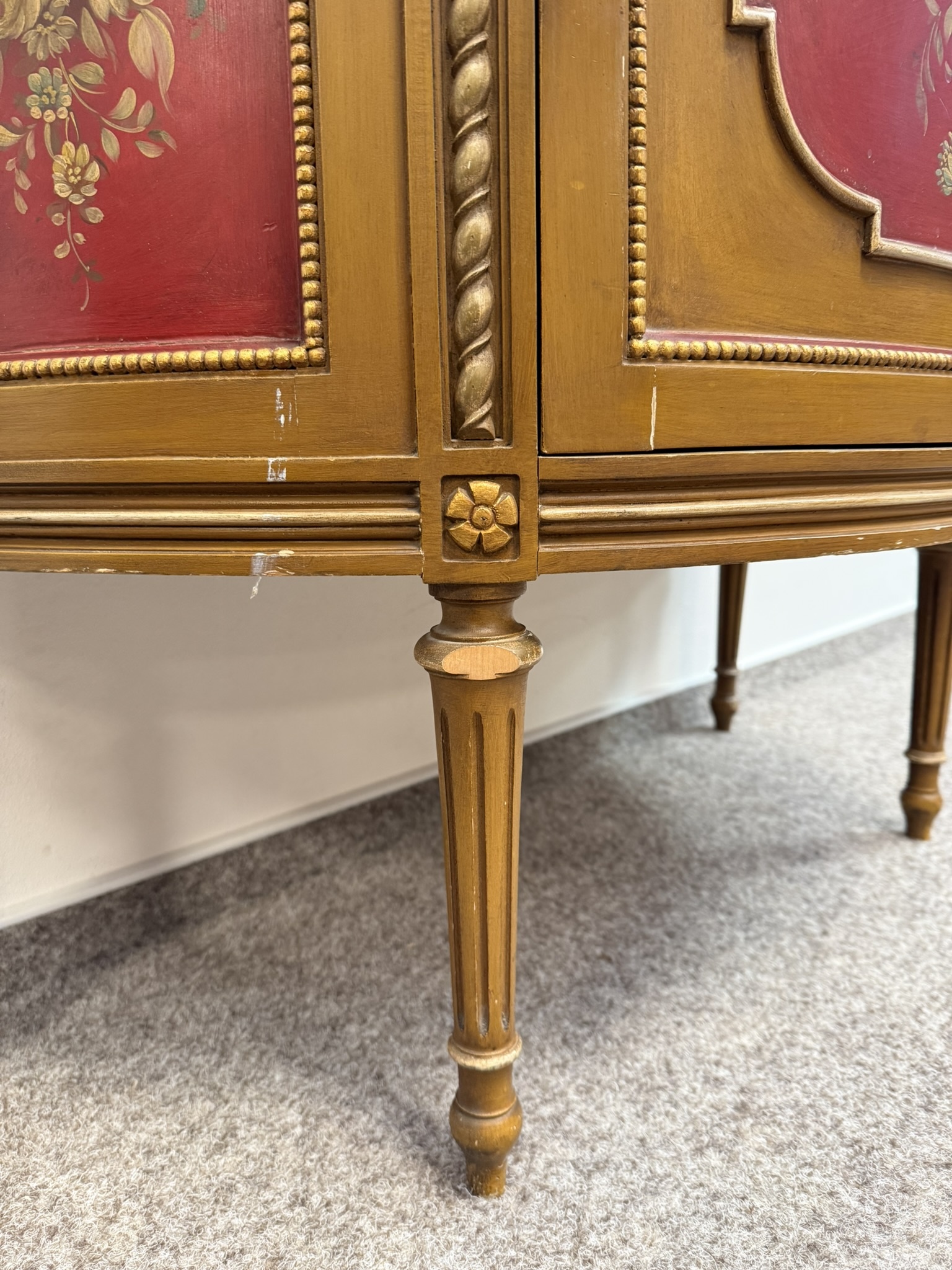 Vitrína s presklenou hornou časťou a červeným zamatovým pozadím. Spodné dvierka zdobia ručne maľované florálne motívy v rámovaní s nádychom starozlatej. Detaily ako čapované stĺpiky, drobná rezba a korunka s patinou.970 €