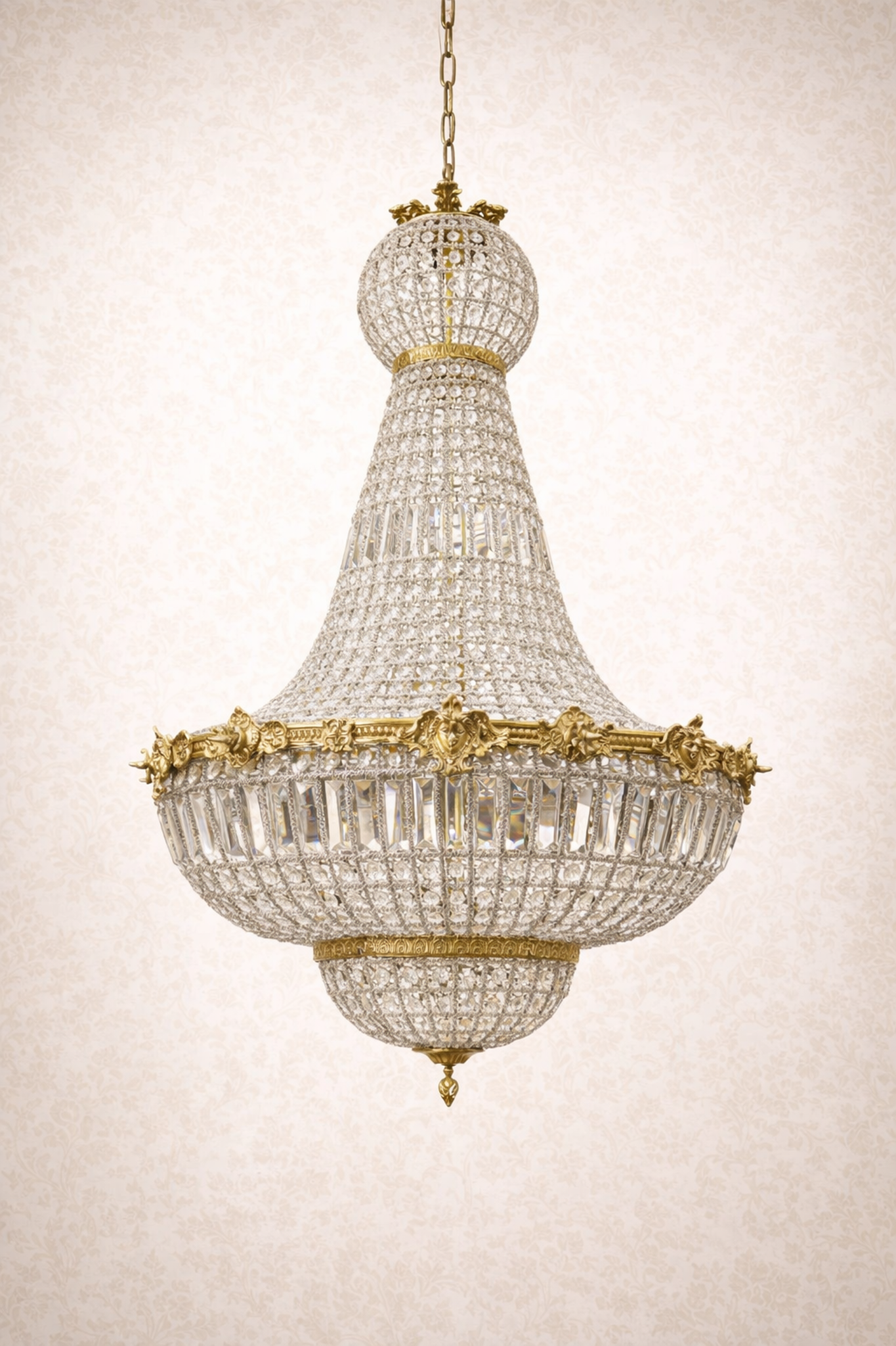 Reprezentatívny závesný luster, osadený množstvom čírych sklenených prvkov, ktoré vytvárajú bohatý a efektný svetelný dojem. Kovová konštrukcia je zdobená dekoratívnym vencom so štylizovanými maskarónmi, dodávajúcimi lustra výrazný historizujúci charakter. Symetrický, viacúrovňový tvar s rozšíreným stredom a spodným zakončením pôsobí elegantne a vyvážene.283,39 €